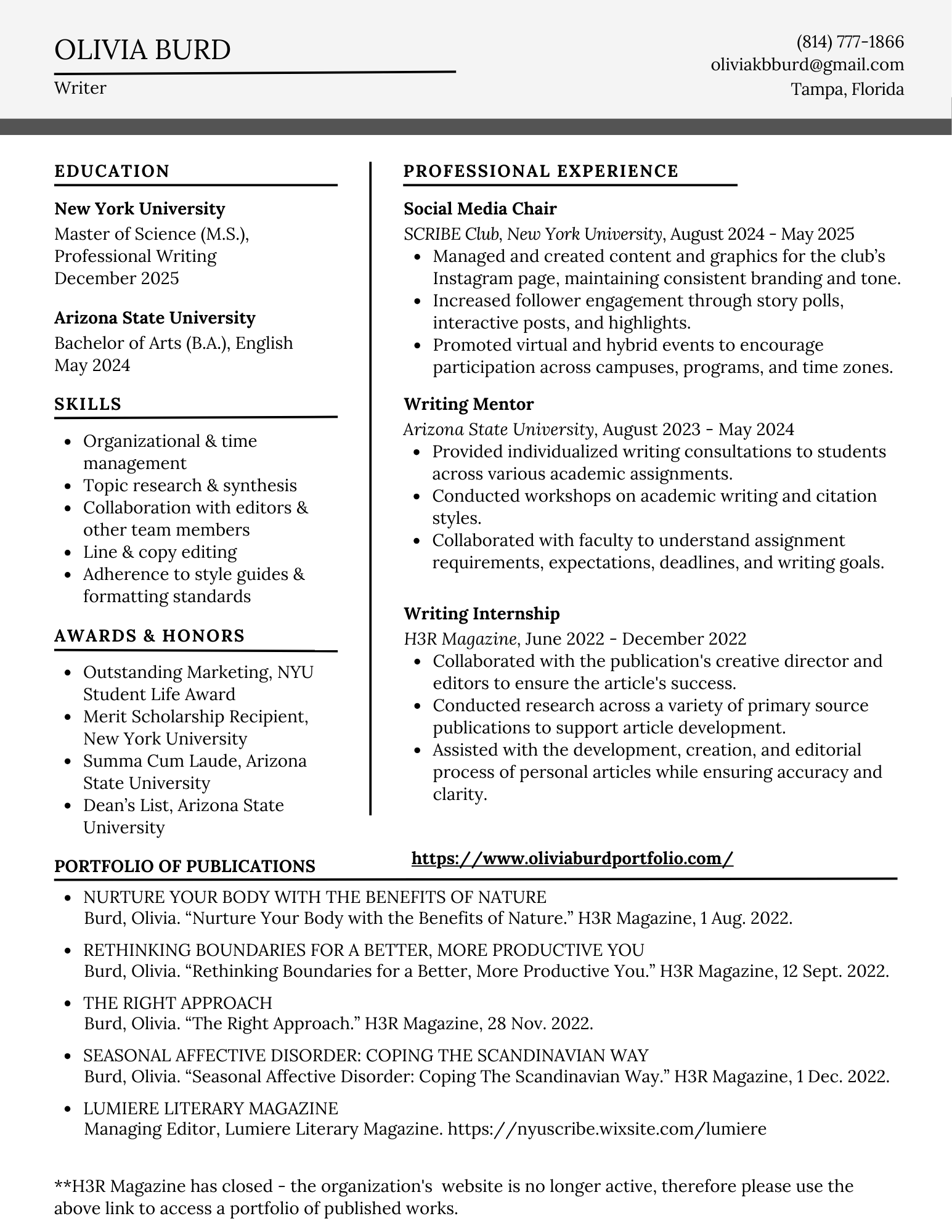 My name is Olivia Burd. I hold a Bachelor’s degree in English from Arizona State University and a Master of Science in Professional Writing from New York University’s School of Professional Studies. I currently reside in the Tampa Bay Area and look forward to new opportunities.