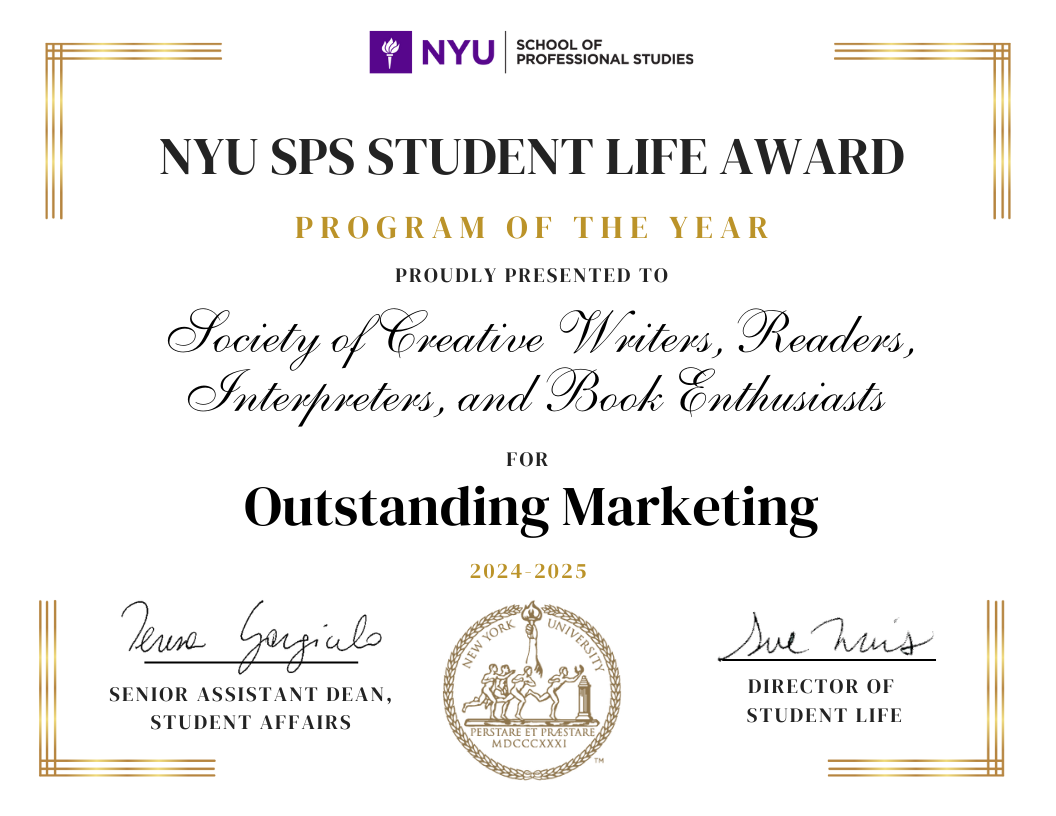 As the elected Social Media Chair for SCRIBE, a student-led organization at NYU supporting graduate students both remotely and in person, I managed the club’s Instagram and led marketing campaigns to promote events and engage members. This section highlights my experience creating strategic content and targeted campaigns to drive participation and build community. At the end of the 2024-2025 academic year, SCRIBE was awarded the Outstanding Marketing Award presented by NYU Student Life (pictured below).